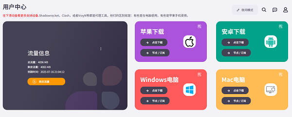 1.安装成功后,打开桌面的Clash for windows图标,然后【点击我到用户中心】,在点击【微软电脑】添加【节点/配置】,点击自动添加配置